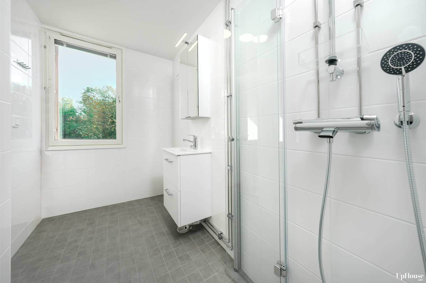 Kylpyhuoneen varusteet | Suihku, suihkuseinä, pesukoneliitäntä, allaskaappi, peilikaappi ja pesuallas |
