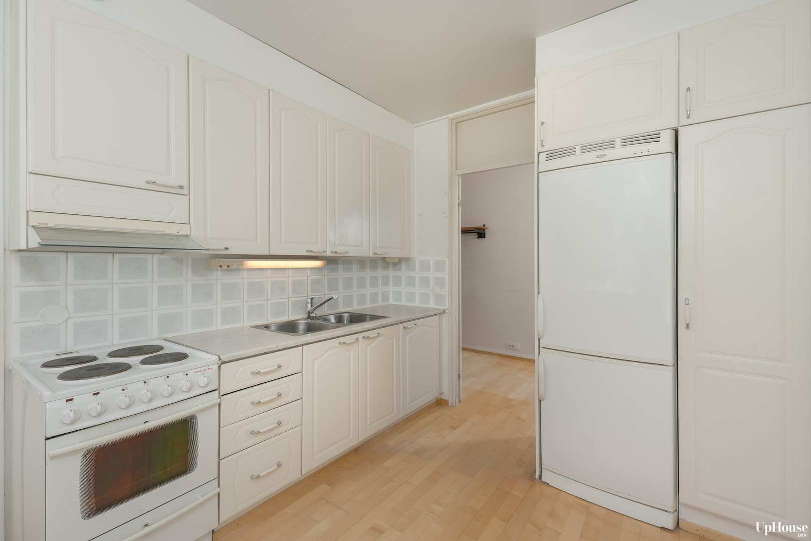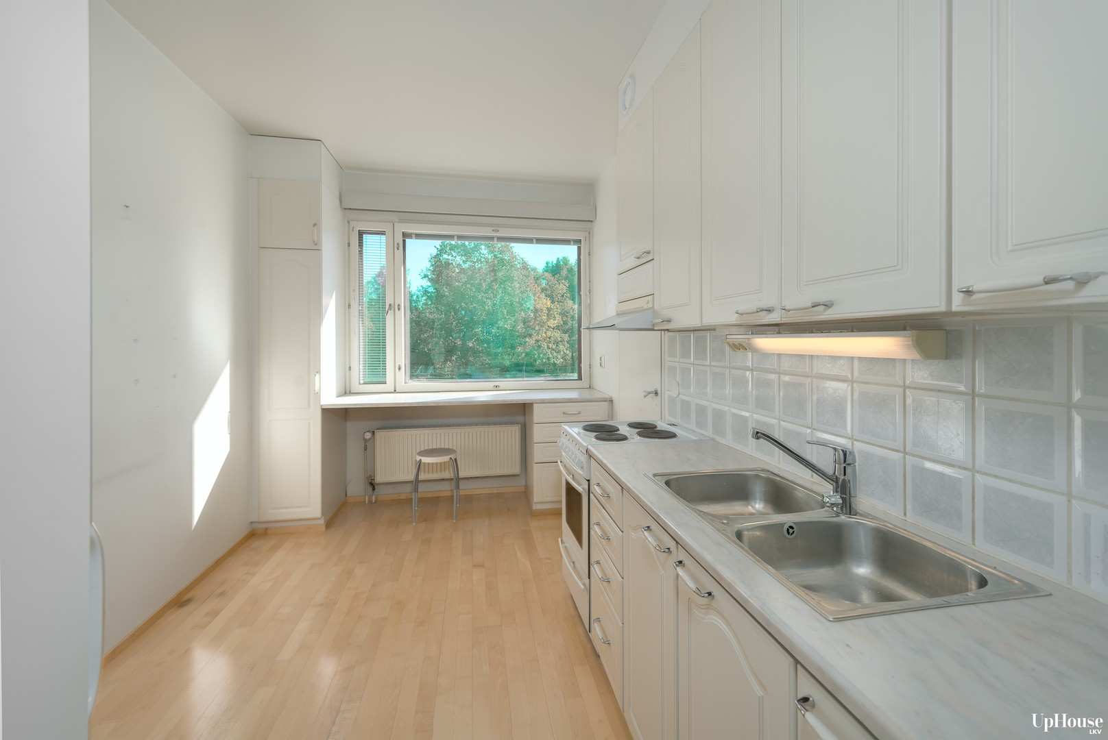 Keittiön materiaalit | Lattia: Parketti Seinät: Maali ja kaakeli |