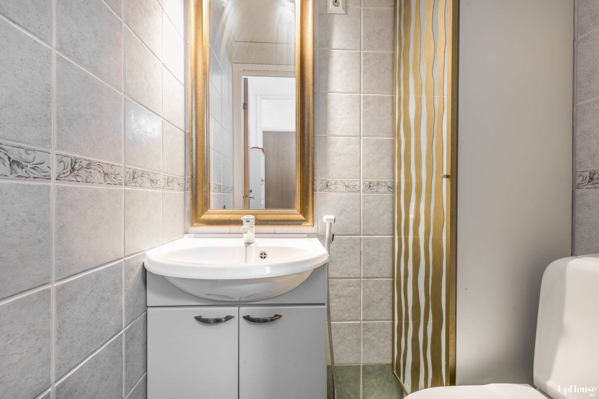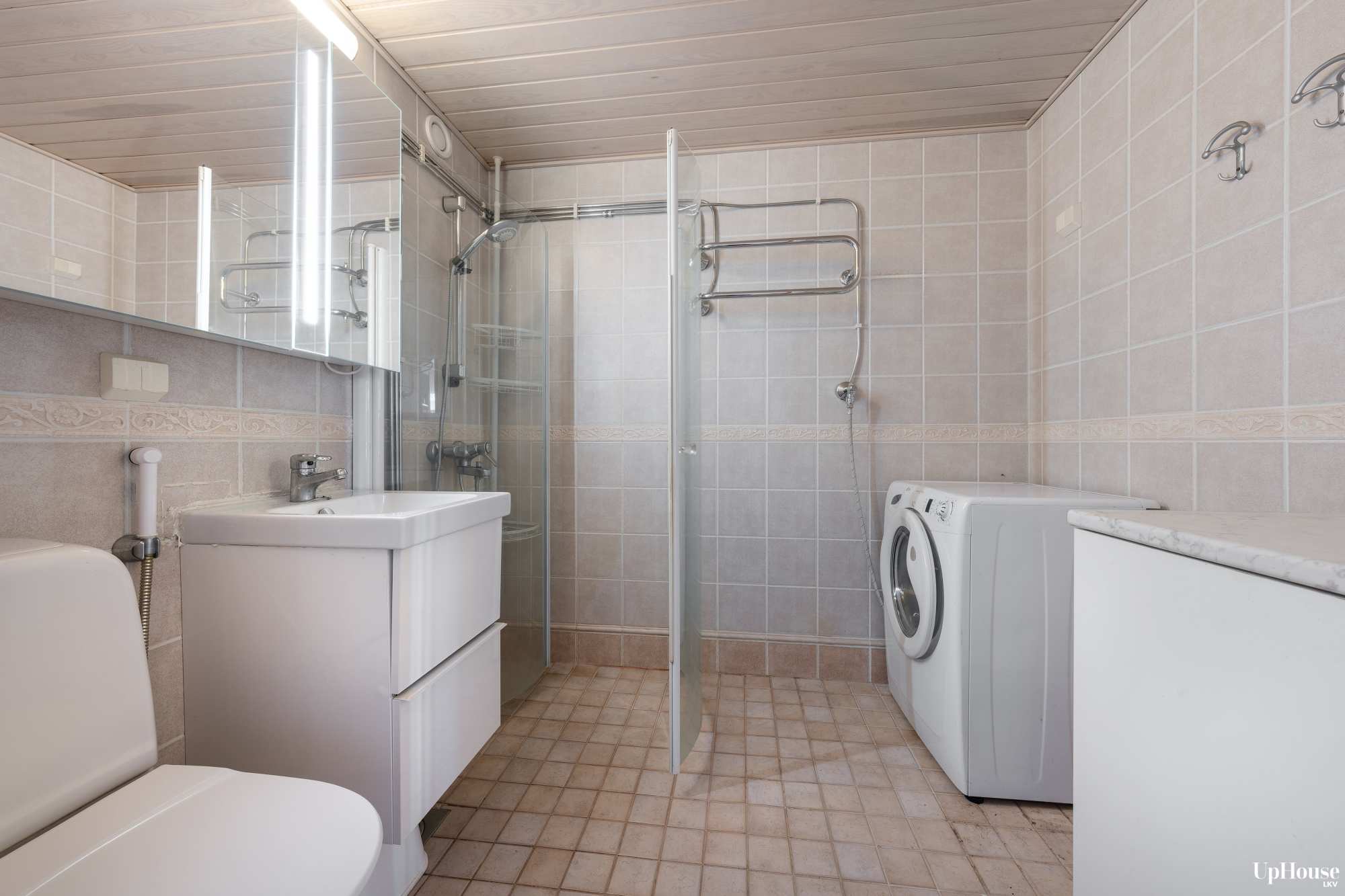 Kylpyhuoneen varusteet | WC-istuin, suihku, suihkuseinä, pesukoneliitäntä, pesuallas, allaskaappi ja peili |