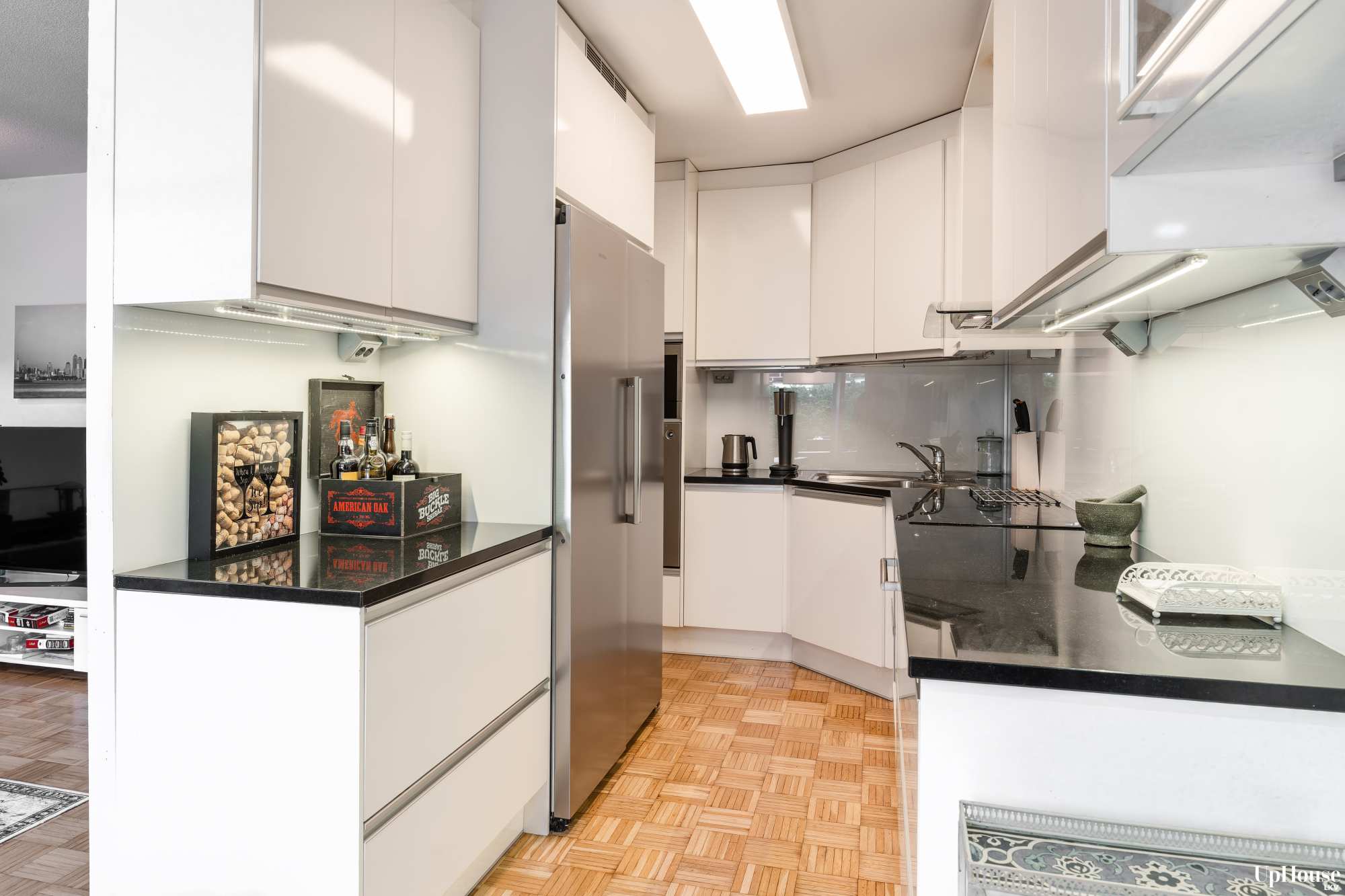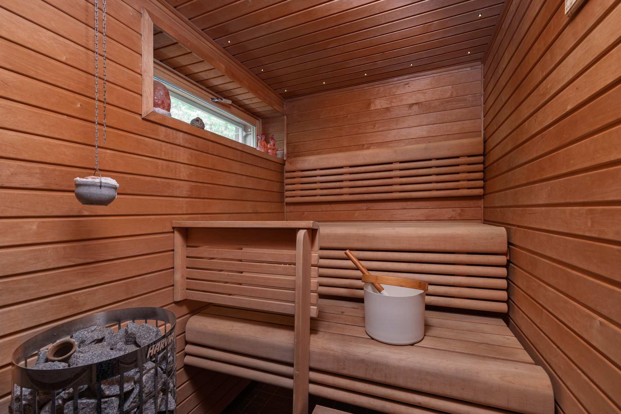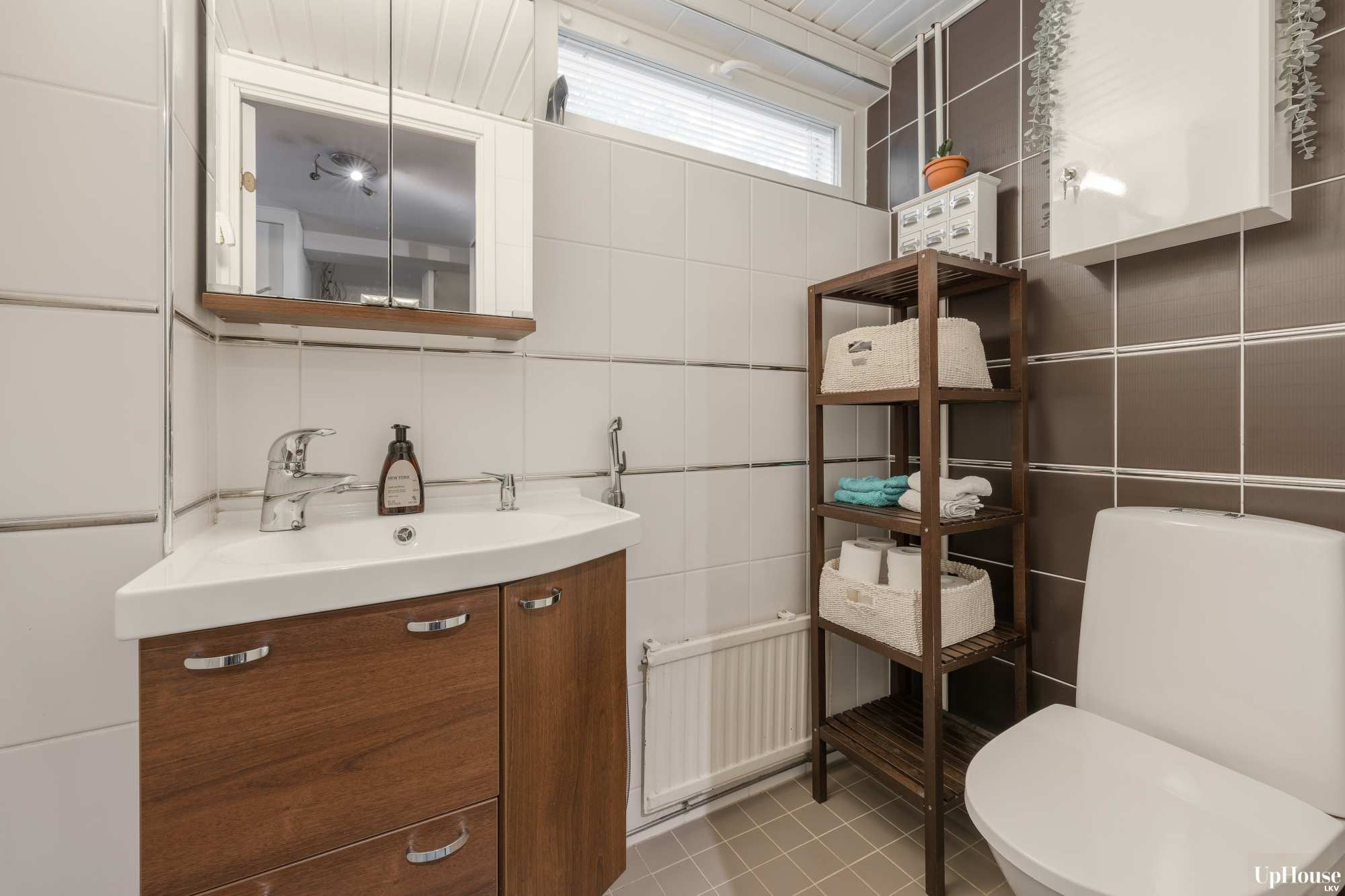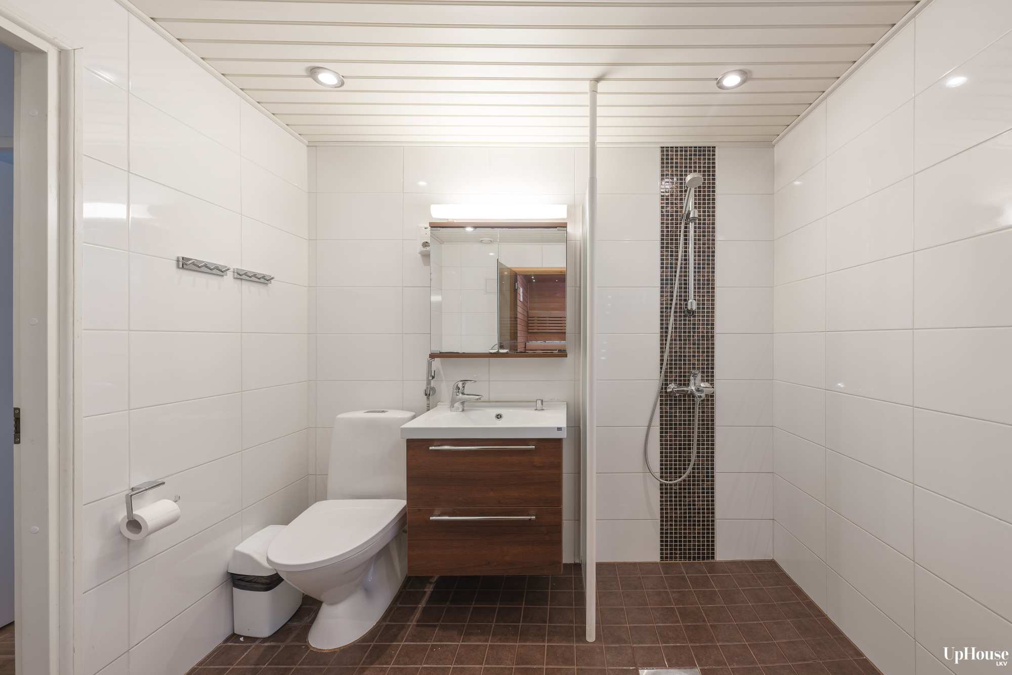 Alakerran olohuone ja keittiö ovat avarat ja valoisat, ja niiden parkettilattiat tuovat lämpöä sisustukseen. Keittiö on varusteltu laadukkaasti, ja siellä on kivitasot sekä induktioliesi. Kylpyhuoneessa on lattialämmitys, mikä tekee siitä miellyttävän ympäri vuoden. Oma sauna tarjoaa rentoutumishetkiä pitkän päivän päätteeksi.