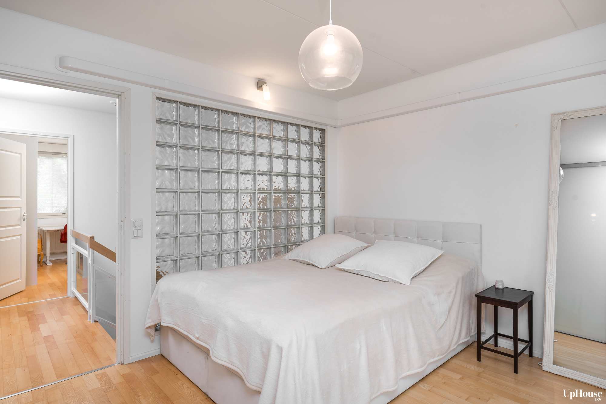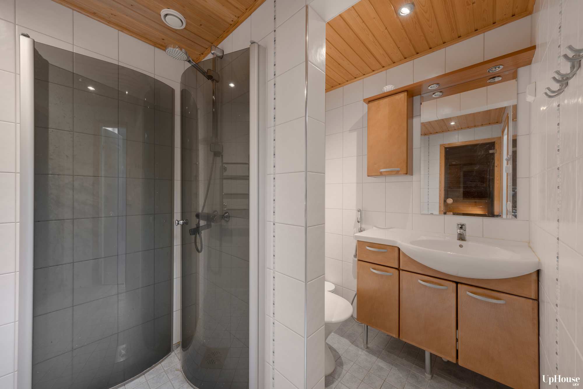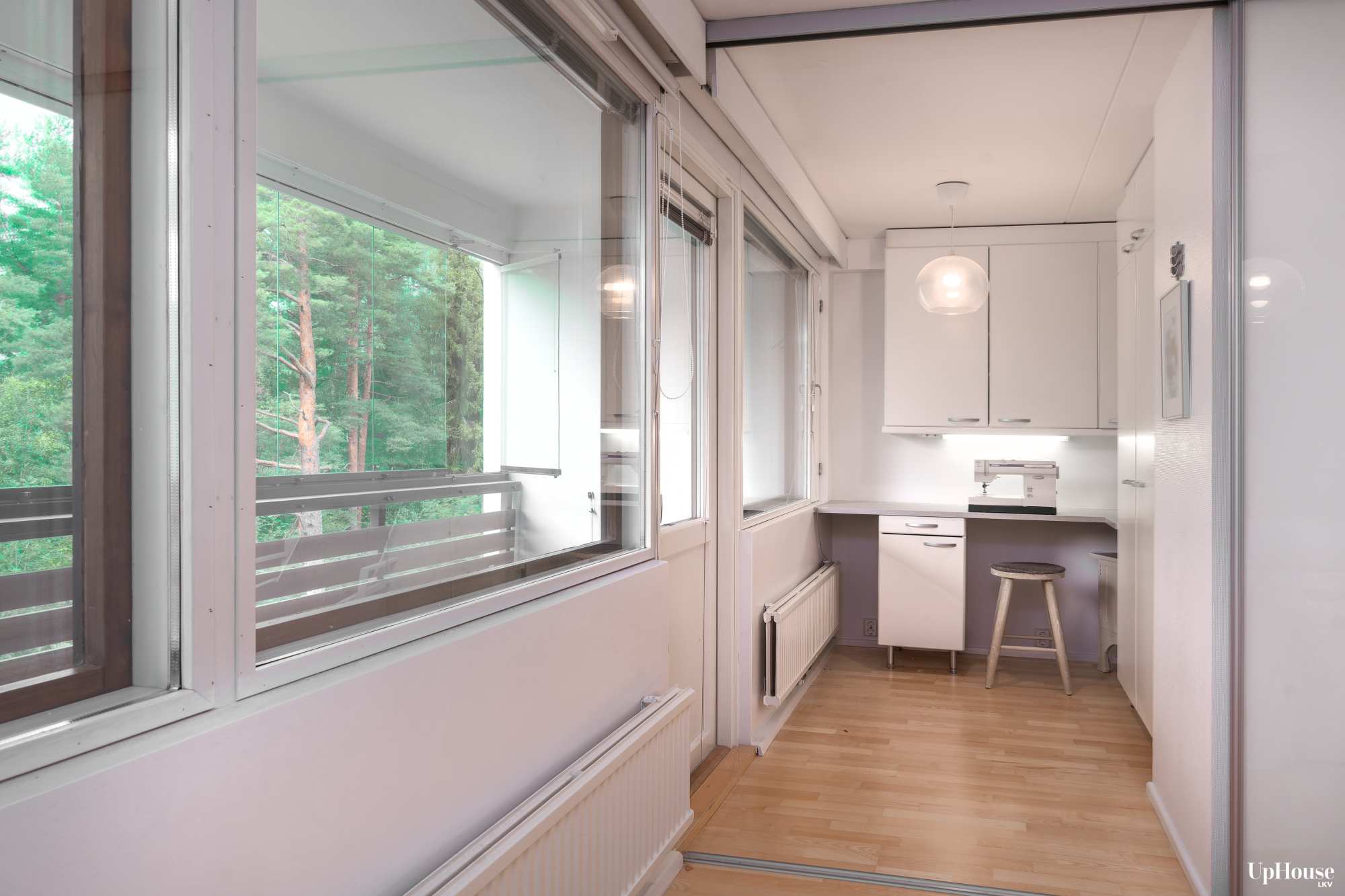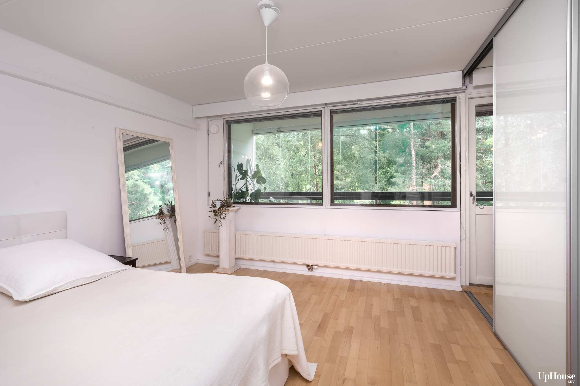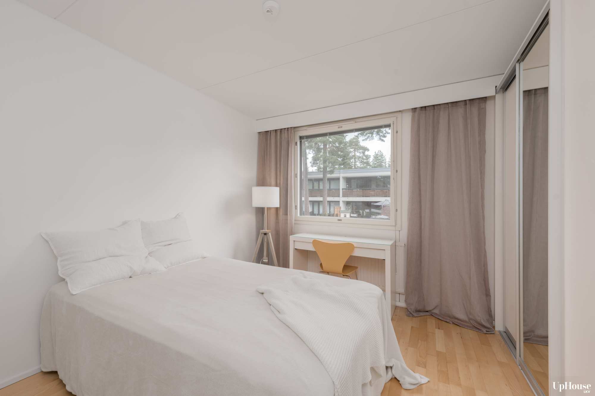 Asunnon kolme makuuhuonetta löytyvät yläkerrasta. Päämakuuhuoneessa on lisäksi kätevä työnurkkaus, joka on suljettavissa omaksi tilakseen liukuovilla, sekä lasitettu parveke. Yläkerrassa lisäksi saunallinen kylpyhuone.