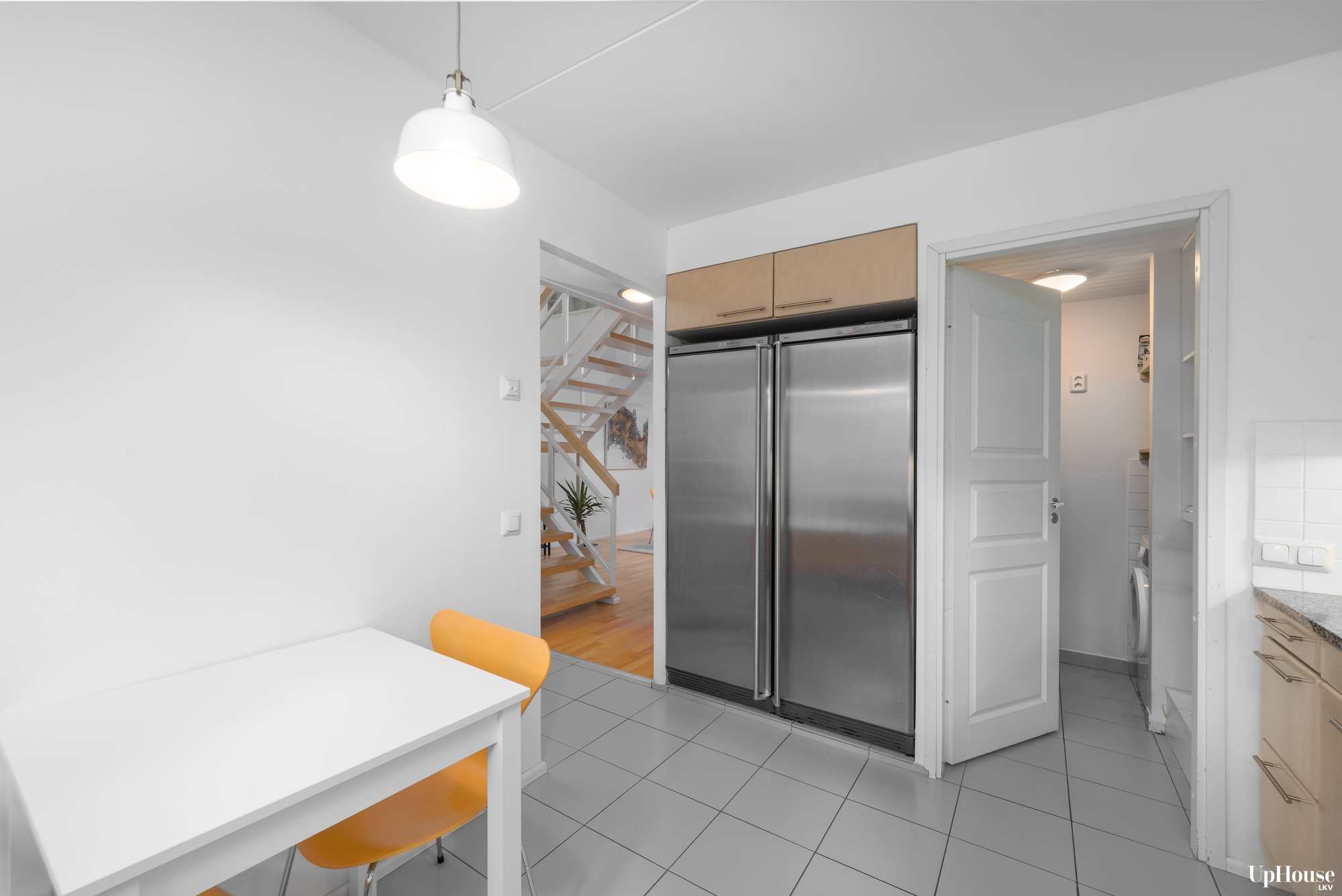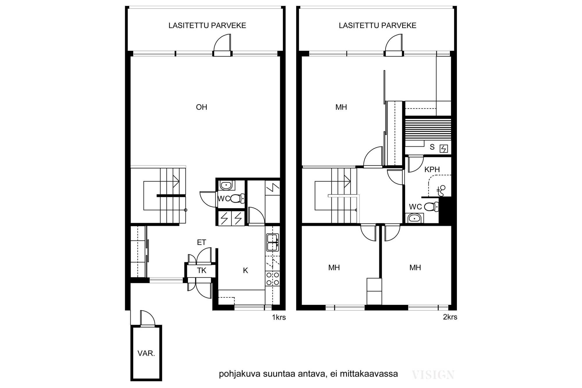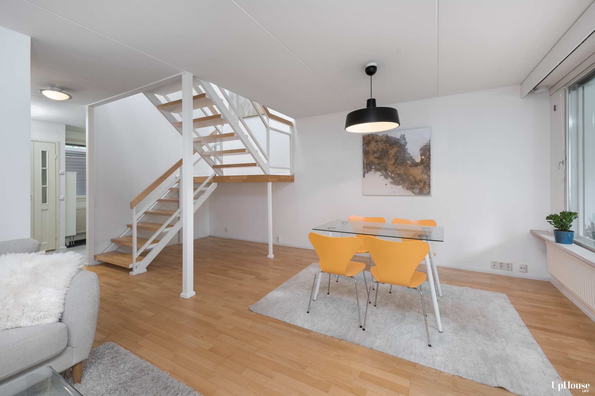 Sisääntulokerroksessa tilava olohuone, wc sekä erillinen keittiö, jonka yhteydessä kodinhoitotila. Olohuoneesta pääsy asunnon levyiselle lasitetulle parvekkeelle.