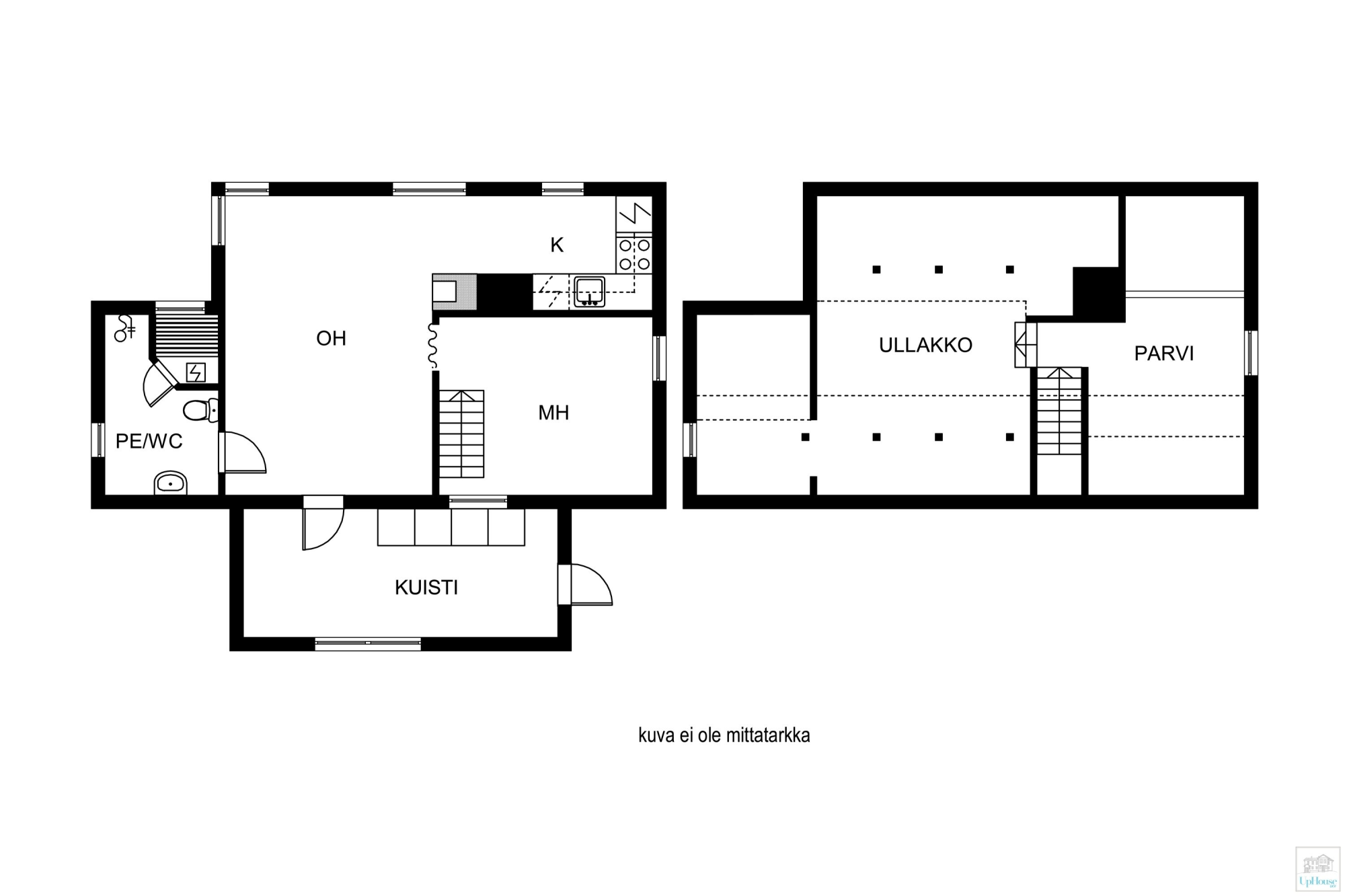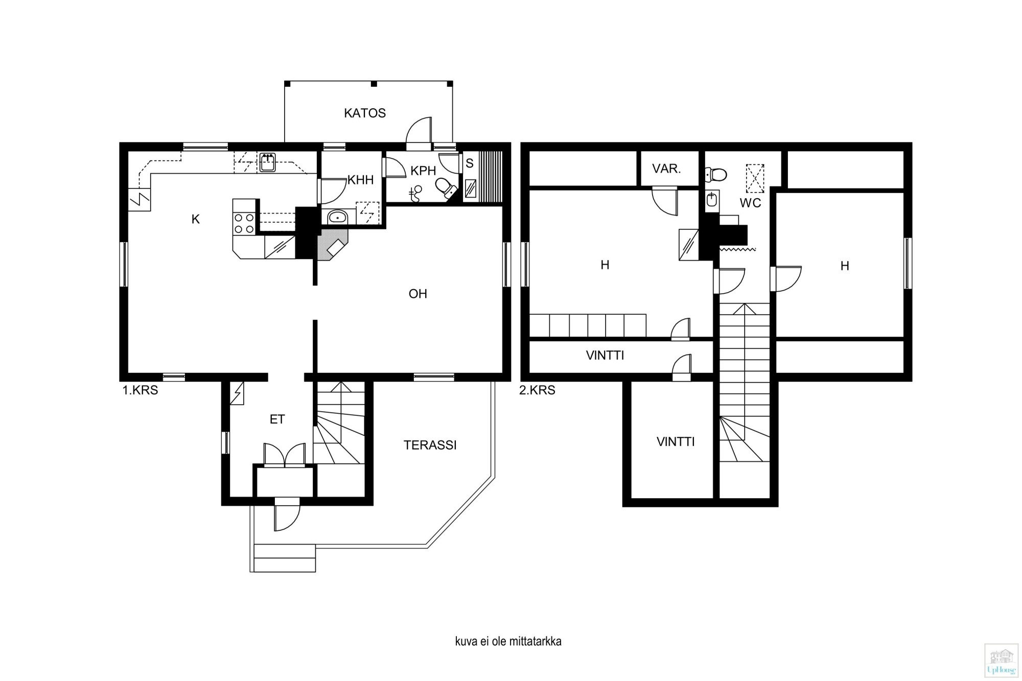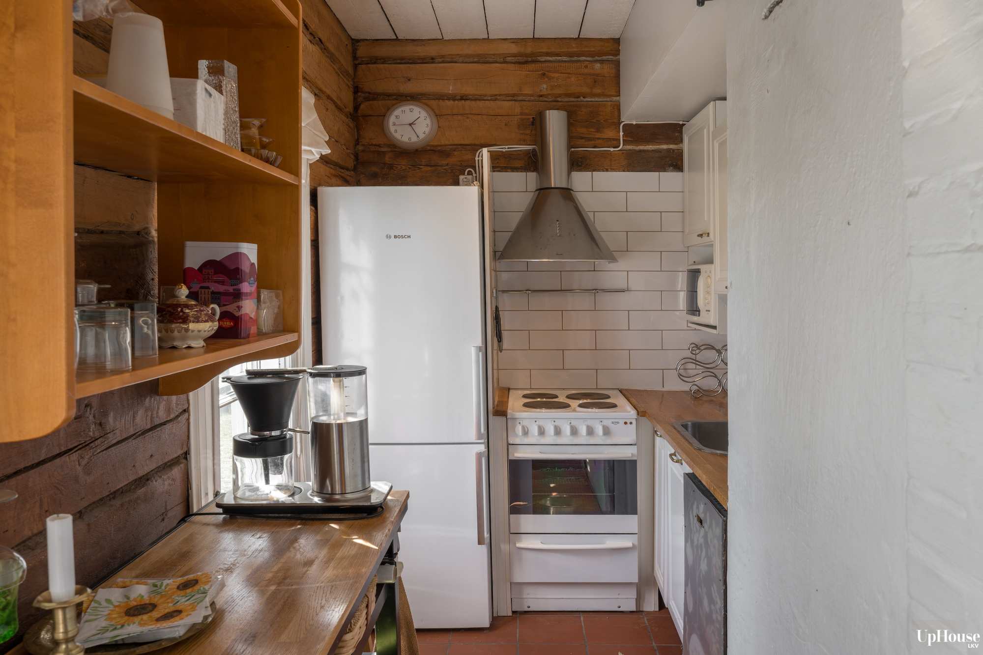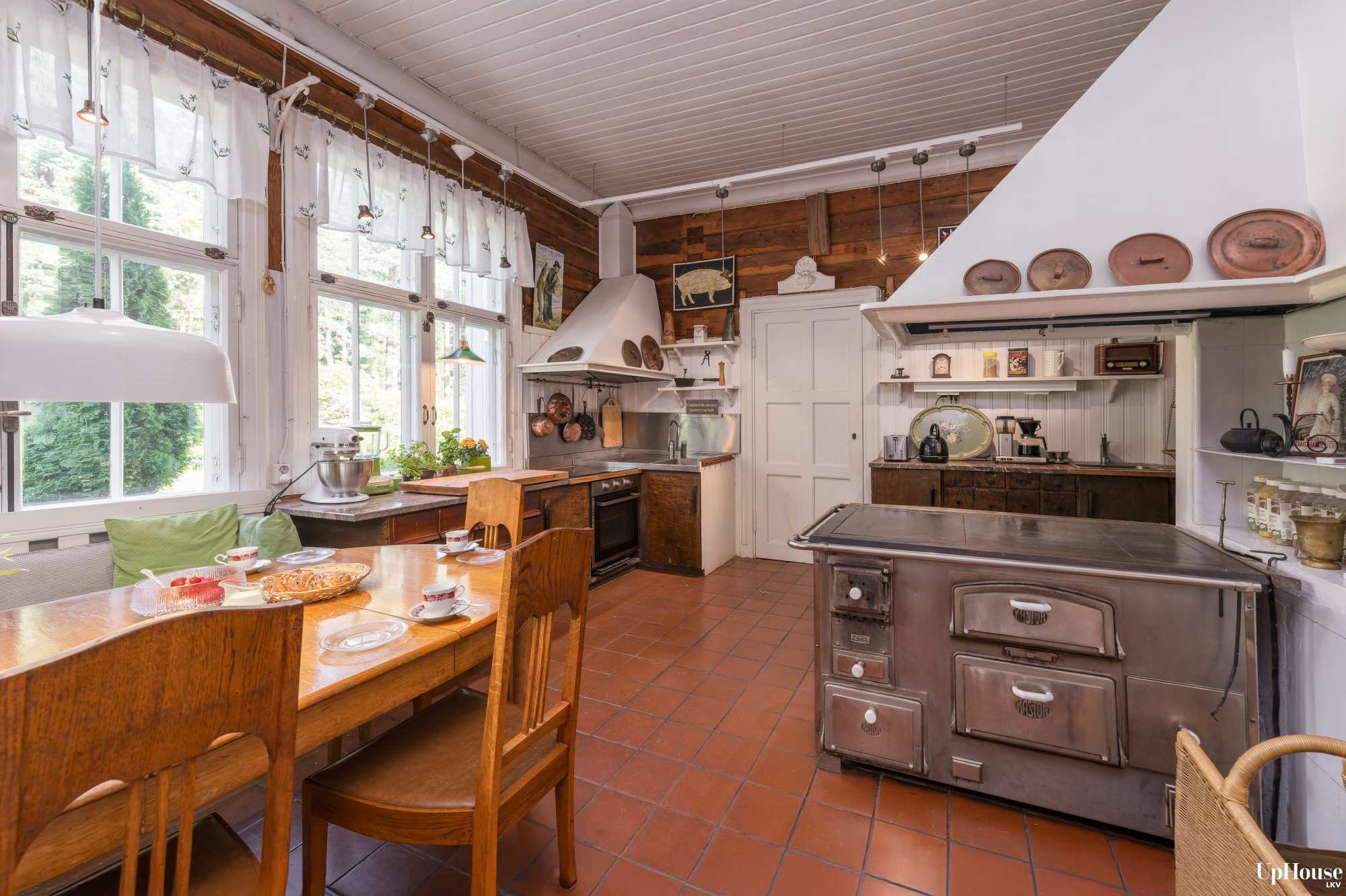 Keittiön varustus | Alakerran keittiö: Tilava keittiö, jossa runsaasti säilytystilaa. Keittiön yhteydessä on tarjoiluvälikkö. Varustelu: astianpesukone, jääkaappi, pakastin, sähköliesi, liesituuletin, uuni, puuhella, kylmäkomero, lämpökaappi lautasille. Seinät hirttä, osittain paneelia ja tapettia. Lattia laattaa. Yläkerran keittiö: Tilasta käynti kylpyhuoneeseen, jossa WC. Lattiat lautaa, seinät tapetoitu. Varustelu: keraaminen liesi, liesituuletin, jääkaappi/pakastin. |