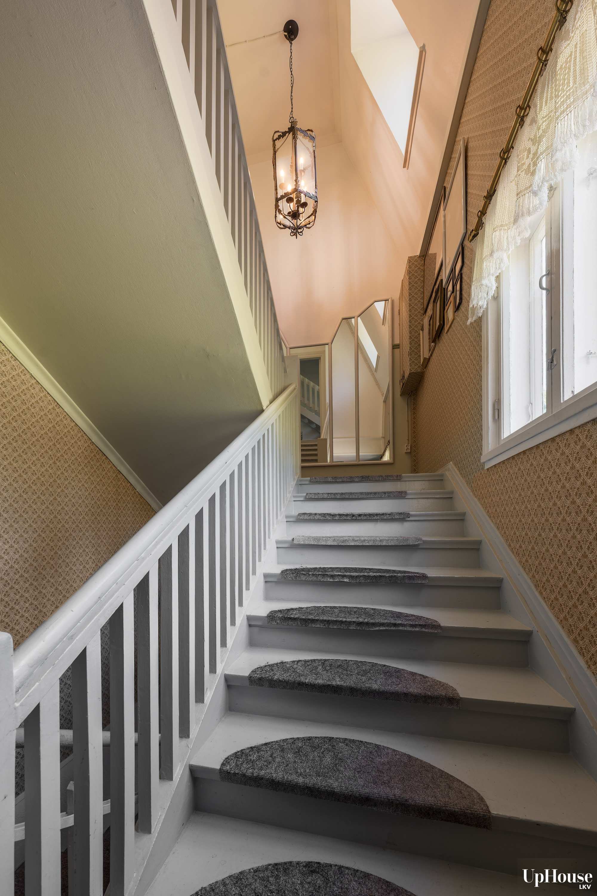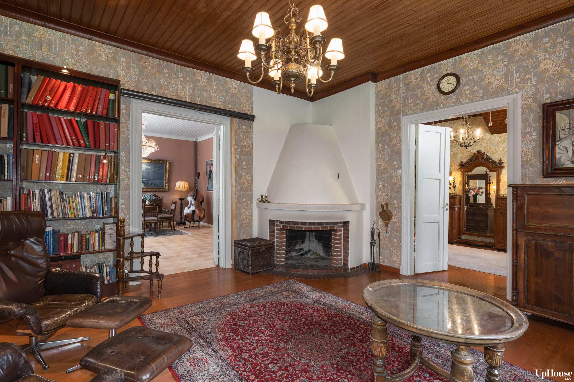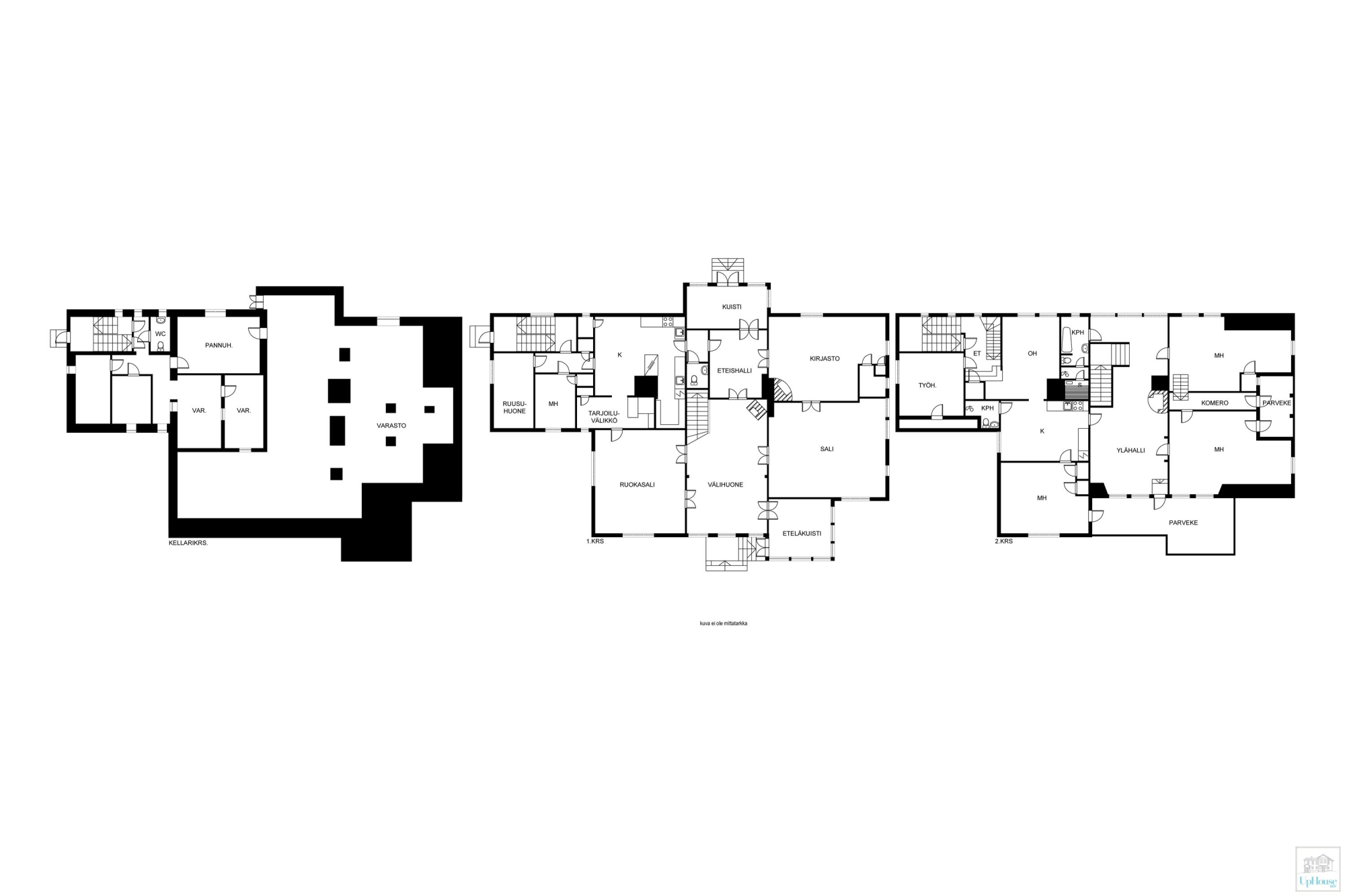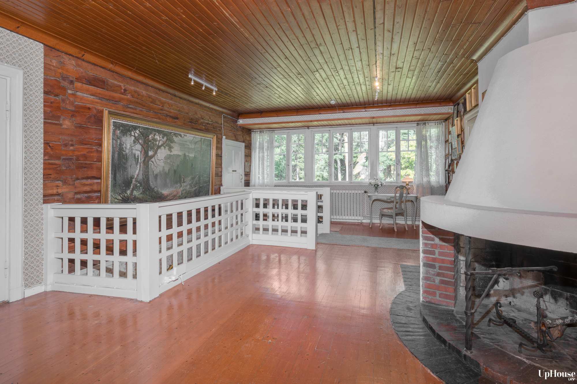 Tilojen kuvaus | Alakerta: Kylmä pohjoiskuisti ja eteläinen lasikuisti, eteishalli, kirjasto, sali, välihuone, ruokasali (ruokasalin pöydän alla lattiassa soittokello tarjoiluvälikköön ja keittiöön), tarjoiluvälikkö, keittiö, 2 makuuhuonetta, WC. Yläkerta: Avotakallinen ylähalli, 4 makuuhuonetta, 2 kylpyhuonetta. olohuone, keittiö + parvikamari ja 2 parveketta. Kellari: Osittain maanpäällä, ikkunallista tilaa runsaasti, käynti pariovista ulos. Sisäseinät osittain tiiltä. Pannuhuone, WC, paljon säilytys- ja harrastetilaa. |