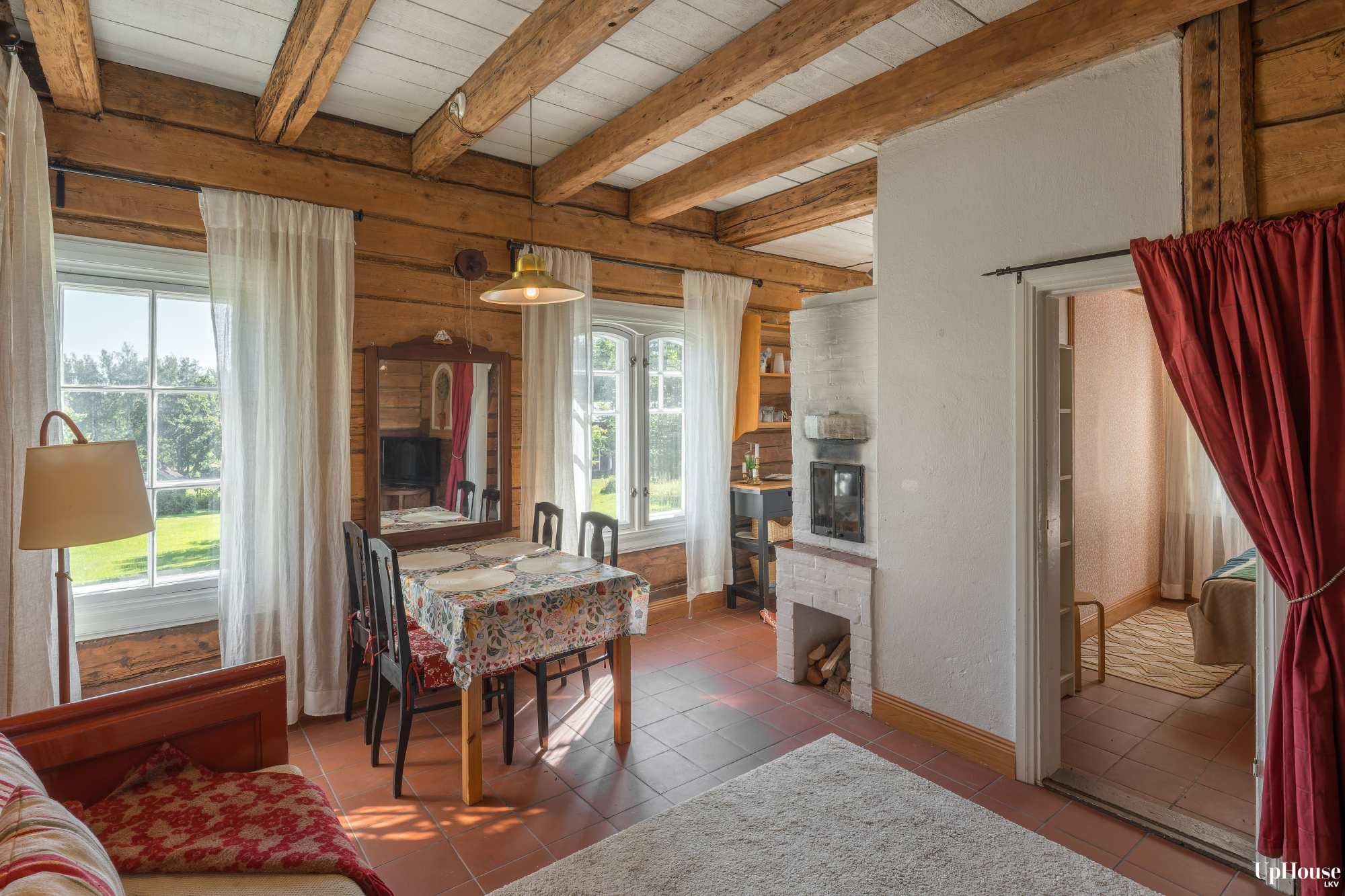Seinät | Kaikissa asuintiloissa seinät on pääosin tapetoitu. Joissakin tiloissa jykevät punahonkahirret ovat esillä. |